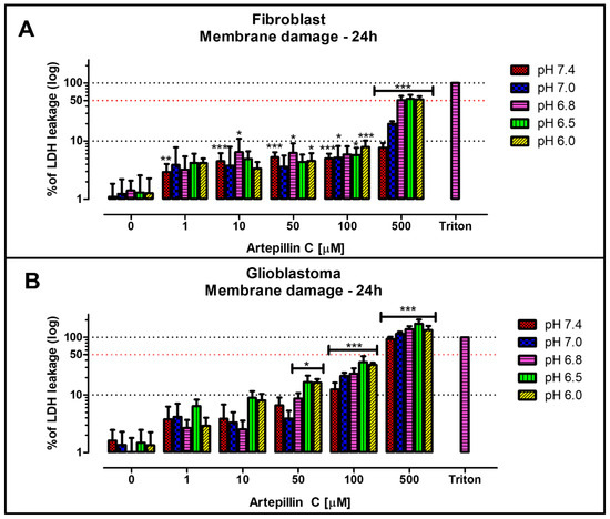 LDH assay representing the percentage of membrane integrity damage obtained for fibroblast (A) and glioblastoma (B) cell lines, after 24 h incubation, exposed to 0, 1, 10, 50, 100, and 500 µM of Artepillin C. Triton was used as the positive control for membrane damage assays, since it solubilizes lipids, releasing 100% of LDH. * for p < 0.05, ** p < 0.01 and *** for p < 0.001 compared to the general control (0 µM Artepillin C, pH 7.4).