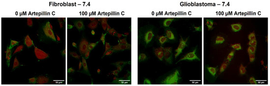 Confocal fluorescence (green) and CARS microscopy (red) images of fibroblast and glioblastoma living cells collected after 24 h of incubation, at pH 7.4, in the absence and presence of 100 µM of Artepillin C. The images are representative of samples analyzed in triplicate.