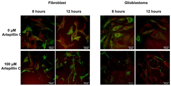 Confocal fluorescence (green) and CARS microscopy (red) images of fibroblast (left) and glioblastoma (right) images were collected after 8 h and 12 h of Artepillin C incubation, at pH 6.0, in the absence and presence of 100 µM of Artepillin C. The images are representative of samples analyzed in triplicate.