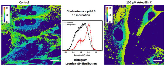 Calculations were rooted in the histogram of pixel distribution across a range of Laurdan GP values for each image, as showcased in Figure 6, for a 1 h exposure to Artepillin C. Intriguingly, when subjected to a pH of 7.4 and exposed to 100 µM of Artepillin C, fibroblast Laurdan GP values exhibited augmentation in comparison to values computed from images of control cells devoid of Artepillin C. It is crucial to acknowledge that Laurdan permeates both cytoplasmic membranes and organelles within the cytosol. As a result, the GP distribution is inherently linked to contributions from both of these regions. The higher value of Laurdan GP in glioblastoma (0.23 ± 0.01) compared to fibroblast cells (0.14 ± 0.02) in normal conditions (pH 7.4, in the absence of Artepillin C) seems to be related to the higher amount of cholesterol esters and triacylglycerols compared to non-cancer cells [45].