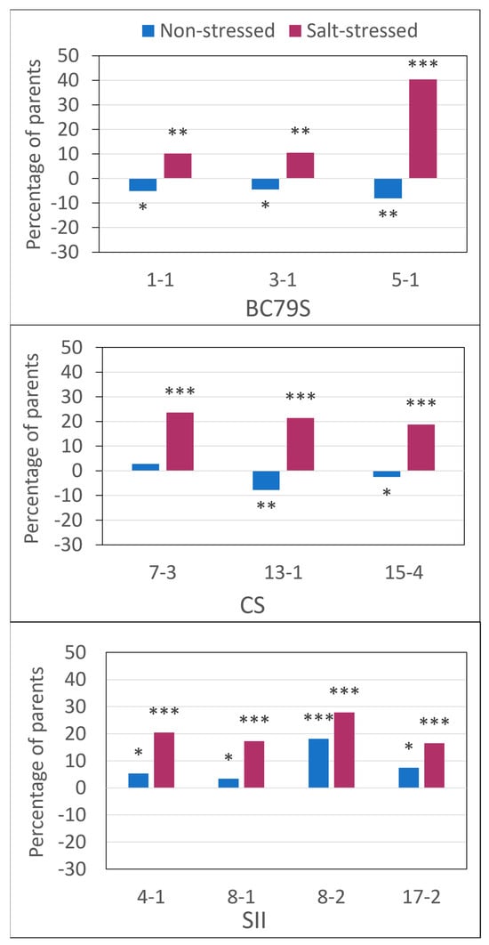 | Non-Stressed | Salt-Stressed | Non-Stressed | Salt-Stressed | Non-Stressed | Salt-Stressed | |||||||