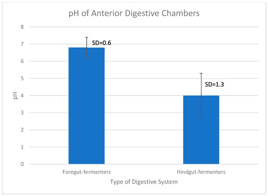 Average anterior-chamber pH of foregut and hindgut fermenters. There is a ~2.8 point difference between the avearge pH of the first digestive chamber of foregut (pH = 6.8) and hindgut fermenters (pH = 4). Data were taken from Table 1 and Table 2. The bars indicate the standard deviation (SD). An independent two-tailed Student’s t-test was performed using the calculator on the site https://www.socscistatistics.com/tests/studentttest/default2.aspx (accessed on 5 November 2023). The t-value is 6.51328. The p-value is <0.00001. The result is significant at p < 0.05. Standard deviation was calculated using https://www.calculator.net/standard-deviation-calculator.html (accessed on 5 November 2023), and graphed using Excel.