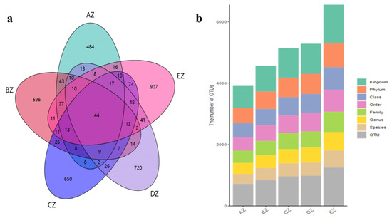 Sequence data analysis: (a) Venn map; (b) annotation statistics. Groups: AZ, BZ, CZ, DZ and EZ. In (b), the different colors represent different taxa.