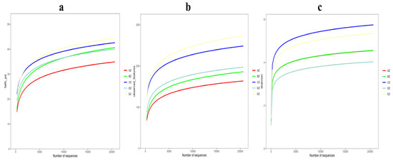 Alpha rarefaction curves for the ST sheep groups: (a) faith_pd; (b) observed_features; (c) shannon_entropy. The different colors represent the different groups of AZ, BZ, CZ, DZ and EZ.