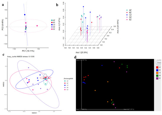 Comparing analyses of the beta diversity index in the ST sheep groups: (a) PCA; (b) PCoA; (c) NMDS; (d) Qiime2. The different colors represent the different groups of AZ, BZ, CZ, DZ and EZ.