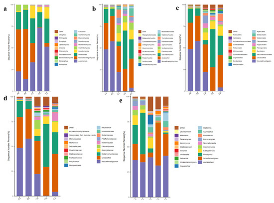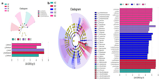 A grouping and clustering heat map analysis found a higher abundance of phyla of Neocallimastigomycota and Chytridiomycota in AZ; Neocallimastigomycota and Bryophyta in BZ; Chlorophyta and Bryophyta in CZ; Ascomycota, Rozellomycota, Anthophyta, Cnidaria and Olpidiomycota in DZ; and Ascomycota, Cercozoa and Blastocladiomycota in EZ (Figure 5a). At the class level, the abundance of Neocallimastigomycetes was higher in AZ and BZ. The abundances of Sordariomycetes, Dothideomycetes, Tremellomycetes, Cystobasidiomycetes and Rhizophydiomycetes were higher in CZ; Saccharomycetes, Sordariomycetes, Microbotryomycetes, Ustilaginomycetes and Rhizophydiomycetes were higher in DZ; and Eurotiomycetes, Sordariomycetes, Wallemiomycetes, Leotiomycetes and Ustilaginomycetes were higher in EZ (Figure 5b). At the order level, Neocallimastigales was higher in AZ and BZ. Higher abundances of Pleosporales, Hypocreales, Filobasidiales, Sordariales and Microascales in CZ; Saccharomycetales, Sordariales, Capnodiales and Cantharellales in DZ; and Eurotiales, Wallemiales, Capnodiales and Helotiales in EZ were observed (Figure 5c). At the family level, Neocallimastigaceae was higher in AZ and BZ. Higher abundances of Filobasidiaceae, Nectriaceae, Trichocomaceae, Didymellaceae and Microascaceae in CZ; Debaryomycetaceae, Trichocomaceae, Cladosporiaceae, Microascaceae and Hypocreales_fam_Incertae_sedis in DZ; and Aspergillaceae, Wallemiaceae and Cladosporiaceae in EZ were observed (Figure 5d). At the genus level, higher abundances of Orpinomyces and Pecoramyces in AZ; Piromyces in BZ; Aspergillus, Naganishia, Talaromyces and Fusarium in CZ; Scheffersomyces, Cladosporium, Xeromyces and Talaromyces in DZ; and Aspergillus, Wallemia and Cladosporium in EZ were detected (Figure 5e). An evolutionary tree of species with a heat map revealed higher abundances of the classes of Agaricostilbomycetes in AZ; Neocallimastigomycetes in BZ; Bryopsida, Tritirachiomycetes and Trebouxiophyceae in CZ; Anthozoa, Archaeosporomycetes, Exobasidiomycetes, Olpidiomycetes, GS13 and Rhizophydiomycetes in DZ; and Ustilaginomycetes, Laboulbeniomycetes, Orbiliomycetes, Cercozoa_cls_Incertae_sedis and Wallemiomycetes in EZ (Figure 6a). At the genus level, higher abundances of Piromyces in BZ; Myrothecium, Aphanoascus, Ectophoma and Coniothyrium in CZ; Lophotrichus, Acremonium, Neurospora, Meyerozyma, Scheffersomyces and Xeromyces in DZ; and Cladosporium, Aspergillus and Wallemia in EZ were found (Figure 6b).