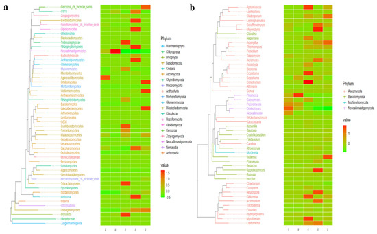 Revealing significant different fungi species among the five ST sheep groups in different taxa via LEfSe. (a) Phylum, (b) Genera.
