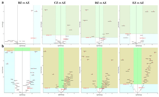 Significant different fungi species among the five ST sheep groups for different taxa according to the DESeq2 volcano map: (a) phylum; (b) genus.