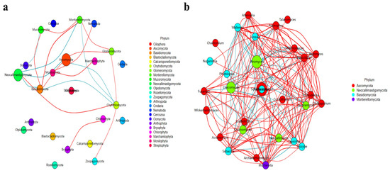 Network analysis of fungi microbiome of the ST sheep for different taxa: (a) phylum; (b) genus.