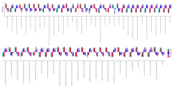 Function comparison through a metaCys pathways analysis showed that there were 63 significantly different pathways among the five ST sheep groups (Figure 10). An enzyme abundance analysis found that there were 770 markedly different enzymes among the current ST sheep groups (Table S5).