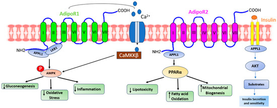 Adiponectin, alternatively referred to as AdipoQ, APM1, or ACRP30, is a single-chain adipokine composed of 244 amino acids, possessing a molecular weight of around 26 kilodaltons (kDa) secreted by white adipose tissue. The adiponectin protein is encoded by the AdipoQ gene located on the chromosome locus 3q27. Adiponectin consists of several distinct structural components. It includes an NH2-terminal hyper-variable region, a collagenous domain consisting of 22 Gly-XY repeats, and a COOH-terminal C1q-like globular domain. When secreted into the bloodstream, adiponectin forms three oligomeric complexes: a trimer, a hexamer, and a high molecular weight multimer [25]. Adiponectin primarily binds to seven transmembrane receptors known as AdipoR1 and AdipoR2 to regulate a range of physiological functions including whole-body energy balance, inflammatory responses, insulin sensitivity, and the process of fat metabolism [26]. Unlike traditional G-protein coupled receptors, these receptors possess a cytoplasmic NH2 terminus and an extracellular COOH terminal domain. AdipoR1 is most abundantly expressed in skeletal muscle, whereas AdipoR2 is predominantly expressed in the liver [27]. In humans and mice, AdipoR1 is situated on chromosome 1p36.13-q41, while AdipoR2 is found on chromosome 12p13.31 and 6 F1. The molecular structure of both forms of the receptor exhibits significant homology, featuring an internal N-terminus and an external C-terminus [28]. AdipoR1 and AdipoR2 (Figure 1) are adiponectin receptors that stimulate AMP-activated kinase (AMPK) and PPAR activity, regulating glucose and lipid metabolism. Adiponectin-induced complete AMPK activation requires both Ca2+/CaMKK and AMP/LKB1 [29].