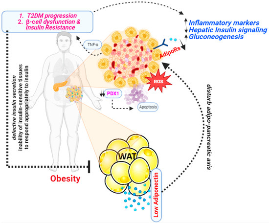 The levels of adiponectin in the bloodstream decline following an elevation in proinflammatory cytokines like TNF-α and IL-6, along with endothelial reticulum stress and adipocyte hypertrophy. This phenomenon is associated with conditions linked to expanded adipose tissue, including obesity, type 2 diabetes mellitus (T2DM), cardiovascular disease, and metabolic syndrome [44].