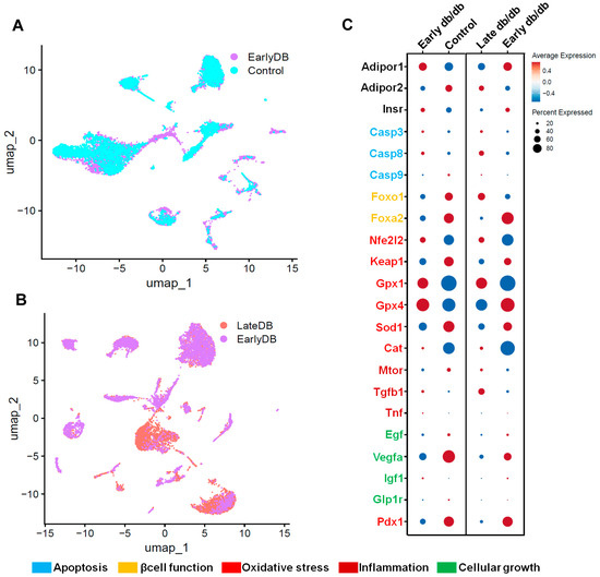 Single-cell UMAP visualization depicting the cellular landscape comparison of Early db/db vs. Control (A) and Late db/db vs. Early db/db (B) of pancreatic islet cells. The differential expression of critical genes in adiponectin signaling, apoptosis, β-cell function, oxidative stress, inflammation, and cellular growth are depicted in color indications (C).