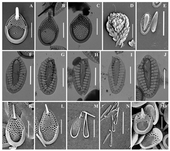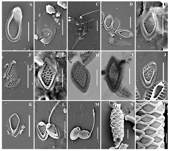 Mallomonas taxa from Southern Urals, Russia: (A–C) M. akrokomos, (A) apical scale, (B) body scale, (C) whole cell; (D,E) M. annulata; (F–J) M. alata, (F) apical scales, (G–I) body scales, (J) caudal scale; (K) M. costata; (L,M) M. crassisquama; (N,O) M. eoa. Scale bars: (C,F,K–N): 5 µm, (A,B,D,E,G–J,O): 2 µm. SEM: (A–G,J–O). TEM: (H,I).