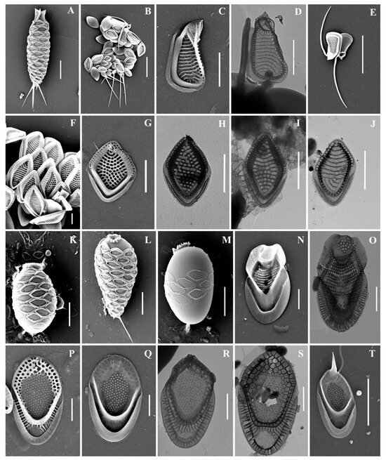 Mallomonas taxa from Southern Urals, Russia: (A–M) M. doignonii, (A) whole cell, (B) different types of scales, (C–E) collar scales, (F–J) body scales, (K–M) stomatocyst 7 Ignatenko et Yatsenko-Stepanova; (N,O) M. lelymene; (P–T) M. insignis, (P–S) body scales, (T) apical scale. Scale bars: (A,B,E,K,L): 5 µm, (C,D,G–J,M–T): 2 µm, (F): 1 µm. SEM: (A–C,E–G,K–N,P,Q,T); TEM: (D,H–J,O,R,S).