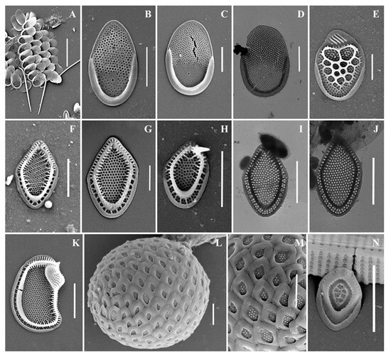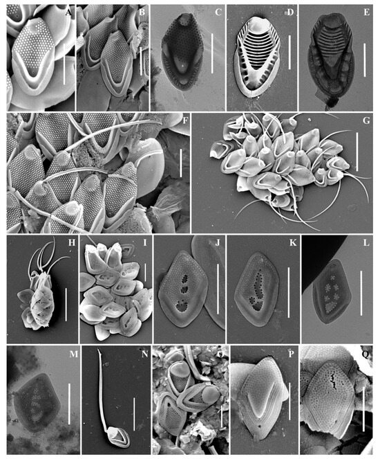 Mallomonas phasma(Figure 4F–K). Three types of scales were found: collar scales (Figure 4K), body scales (Figure 4F,G,I,J), and rear scales (Figure 4H). The collar scale is asymmetrical with strongly convex dorsal margin, and measures 4.4 × 2.8 µm. The anterior submarginal rib of the collar scale on the dorsal side is widened, ending in a short spine on the edge from the side of the dome. The dome is wide, covered with ribs and papillae. The base-plate pores are evenly spaced on the shield. The posterior and anterior flanges with the base-plate pores and struts extending from the submarginal ribs both to the edges and to the shield. Body scales are rhombic, measuring 3.1–3.8 × 2.0–2.5 µm, without dome, and with well-developed anterior submarginal ribs. The anterior submarginal ribs have struts extending towards the anterior flanges and shield. The shield is covered with densely and evenly spaced base-plate pores. Sometimes there are thickenings of the secondary siliceous layer, extending from the struts and forming a network structure. The posterior flange has base-plate pores. The rear scale (2.8 × 1.9 µm) is slightly asymmetrical, characterized by the presence of a small spine formed by the continuation of the anterior submarginal rib.