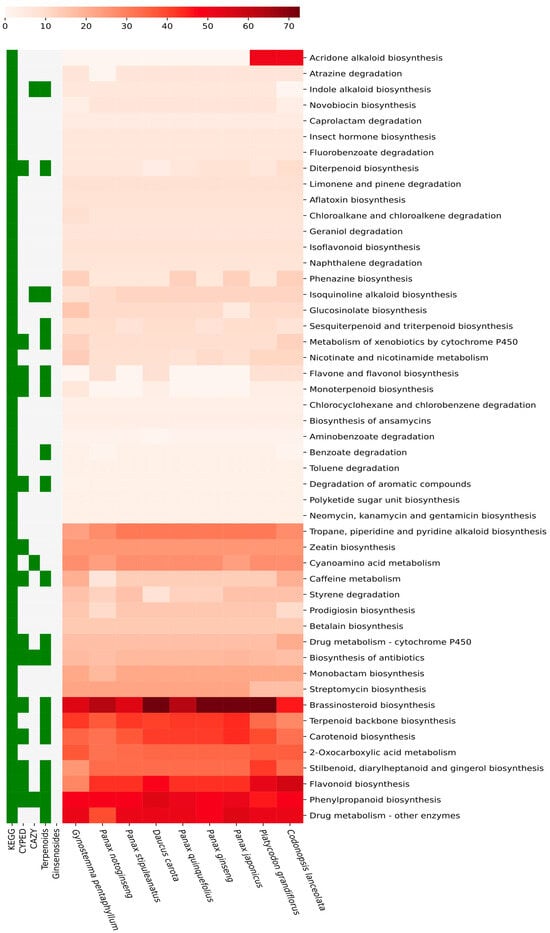 We included the manually curated ginsenoside conversion microbial enzymes [27] and enzymes involved in the ginsenoside biosynthesis pathway from MetaCyc database [28], along with nine genome proteomes. Moreover, we obtained the KEGG secondary metabolite pathways from KEGG pathway database (https://www.genome.jp/kegg/pathway.html, accessed on 1 February 2023) and extracted respective protein sequences and other information, such as pathway name and KEGG orthologs ids, using Python scripts. Additionally, the coverage values for the pathway were calculated following the method described by Kim et al. [29], as follows: