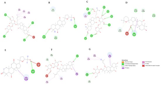 2D interaction diagram of seven CYP716 family enzymes with the highest ranking ginsenosides. (A) CYP716A12, (B) CYP716A52, (C) CYP716A53, (D) CYP716A15, (E) CYP716AL1, (F) CYP716A47, and (G) CYP716A17.