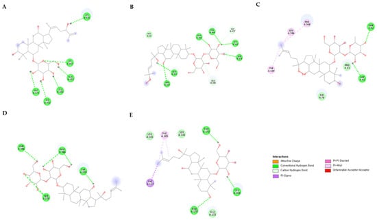 2D interaction diagram of five UGT1 family enzymes with the highest ranking ginsenosides. (A) UGTPg100, (B) UGTPg101, (C) UGT74AE2, (D) UGT71A27, and (E) UGT94Q2.