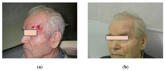 Patient B. 76 y.o.: (a) Locally advanced basal cell carcinoma of the forehead; (b) 3 years after cryosurgery treatment without evidence of the disease, excellent aesthetic and functional results.