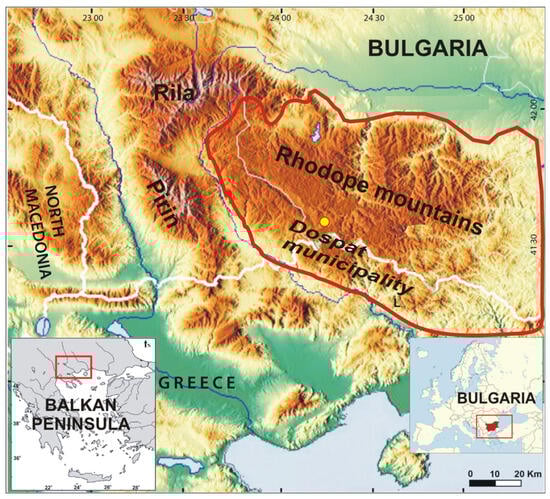 The Rhodope Mountains, or the Rhodopes, are the largest mountain range in Bulgaria, located in the southern part of the country (Figure 1). The Rhodopes are divided into two parts: western (average altitude of 1098 m) and eastern (average altitude of 329 m). Mountainous climate prevails in the higher altitude regions of the western Rhodopes, transitional continental climate dominates the lower altitude regions, while the southern parts are characterised by Mediterranean climate. A study by Zahariev et al. [] revealed that the medicinal plants in the Rhodopes included 714 species belonging to 393 genera and 101 families. The largest part of this area has been designated as a protected area within the NATURA 2000 European ecological network aimed at the protection of rare and threatened habitats, plants, and animals. The medicinal plants are found mainly in grasslands and meadows, but they face the risk of extinction due to negative environmental changes. The most common medicinal plants in the Rhodope Mountains belong to the Asteraceae, Lamiaceae, Rosaceae, Amrillydaceae, Crassulaceae, Plantaginaceae, Oleaceae, and Solanaceae families []. Although Bulgaria is the second largest European exporter and one of the world’s leading exporters of herbs, the information about the botanical diversity, the phytochemical composition, and the biological properties of the wild plants growing in mountainous regions, the Rhodope Mountains in particular, is still very limited [].
