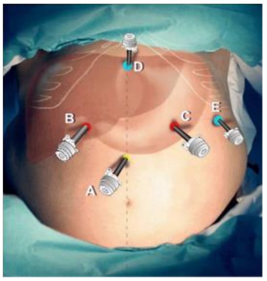 Figure 1: a 10 mm camera port is placed along the midline in the supraumbilical region; a 10 mm primary working port is positioned along the midclavicular line in the right lumbar region; a 10 mm secondary port is placed symmetrically along the left midclavicular line; a 5 mm assistant port is positioned laterally at the left subcostal margin; a 5 mm a liver-retraction port is placed along the midline in the subxiphoid region. For total gastrectomy, the liver-retraction port is placed laterally to the right operator port in the right abdomen.