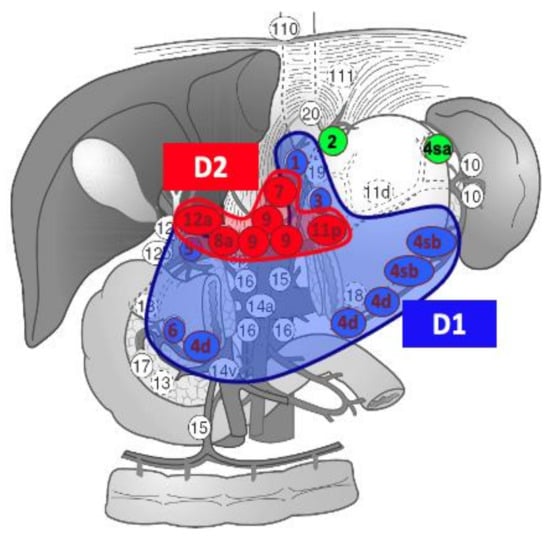 6]. In the East, gastrectomy with D2 lymphadenectomy is considered the gold standard for resectable gastric cancer. Concerning the findings in the Western population, in 2020 the 15-year follow up results of the Dutch Gastric Cancer Group Trial were published, and D2 lymphadenectomy was associated with a lower local recurrence (12% vs. 22% in the D1 group) and regional recurrence (13% vs. 19%). Although there was no difference in overall survival between the two groups (OS was 21% in the D1 group versus 29% in the D2 group,