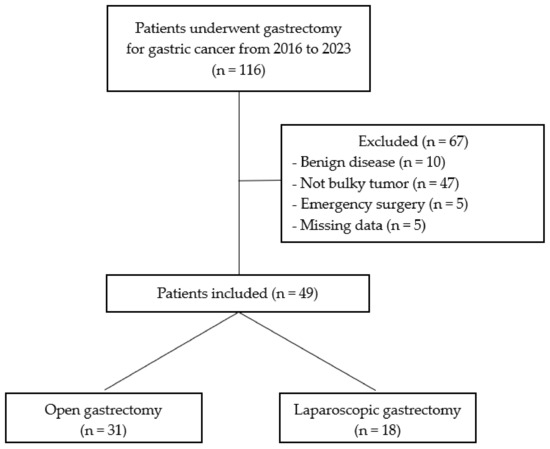 One-hundred and sixteen patients underwent gastric surgery during the study period at our institution. Sixty-seven patients were excluded because they did not meet inclusion criteria. In detail, 10 patients had benign disease, five patients underwent emergency surgery, 47 had no lymph node involvement (N0) or did not have a bulky tumor, and data on five patients were missing.