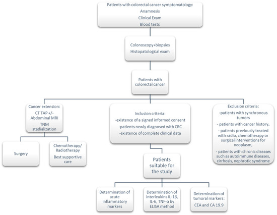 The presence of chronic inflammation in the pathogenesis of CRC is demonstrated in numerous studies and the current study also reinforces this idea. In addition to the inflammatory markers and tumor markers, the pro-inflammatory cytokines, IL-1β and IL-6, and TNF-α serum detection could play an important role in diagnosis and also in prognosis, although their detection incurs increased costs. They may also represent new therapeutic targets for this type of cancer, which affects many people from all over the world, but further multi-center studies involving heterogeneous groups of patients need to be performed.