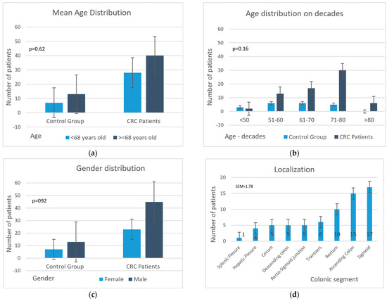 A Mann–Whitney U test was run to determine if there were differences in age between the two study groups. The distributions of the ages for CRC and control patients were similar, as assessed by a visual inspection. The mean age of the CRC patients was higher than the mean age of the control patients, at 68.49 ± 10.31 years old compared to 63.20 ± 10.62 years old; however, this difference between groups was not statistically significant, where U = 485.5, z = −1.939, and p = 0.053. Table 1 summarizes the clinical and demographic characteristics of the patients included in the study.