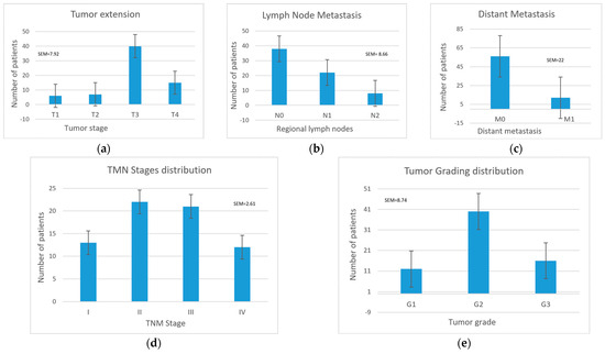 Tumoral characteristics, TNM stage, and tumor grade differentiation classification: (a) tumor size and extent; (b) lymph node metastases; (c) distant metastases; (d) TNM stage; (e) tumor grade.