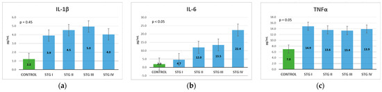 IL-1β, IL-6, and TNF-α levels in CRC patients were increased compared to the control group, the biggest differences being recorded in the case of IL-1β. For IL-1β, an increase was observed between stages I, II, and III, but a decrease was noted in stage IV, which indicates that in the metastatic stage, this cannot be used as a prognostic marker (Figure 4a). As the stage increased, IL-6 had increasingly higher values; in stage IV, it had a level that was almost double in comparison with stage III, meaning that it could be used as a precise prognostic marker (Figure 4b). TNF-α could be used as a diagnostic marker but not so successfully as a prognostic marker, because it showed increased values in patients with CRC compared to the control group, but there were no major differences in the values between the TNM stages (Figure 4c).