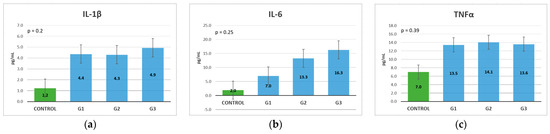 The quantitative assessment of serum concentrations of IL-1β, IL-6, and TNF-α was achieved through the enzyme-linked immunosorbent assay (ELISA) technique, where reagents from Elabscience were used according to their usage protocol. Venous blood (5 mL) was collected à jeune, which was later centrifuged at 3000× g for 10 min. For the samples that were to be processed over a longer period of time, the serum sample tubes were stored at temperatures between −20 °C and −80 °C.