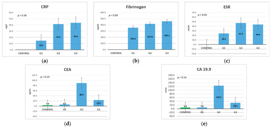 In previous studies, it has been demonstrated that the acute phase reactants, C-reactive protein, the erythrocyte sedimentation rate (ESR), and fibrinogen levels are modified in chronic inflammation and in various types of cancers, including CRC [29,30,31,32,33,34,35]. The tumor markers of carcinoembryonic antigen (CEA) and carbohydrate antigen (CA 19.9) are not diagnostic tests and are used for monitoring patients with CRC, mostly after curative surgical interventions, and are used primarily to detect early cancer recurrence [36,37,38,39].