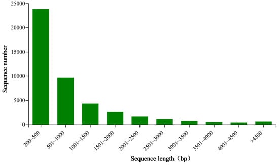 We generated 48 million raw reads from each cDNA library of the E. signifer adult, averagely. Approximately 94.09% of these reads exhibited q30 quality scores on average. The number of 44,905 unigenes, with an N50 of 1488 bp, average length of 859 bp, were obtained (Figure 1 and Table 1). Additionally, BUSCO analysis indicated a completion rate of 89.30%.