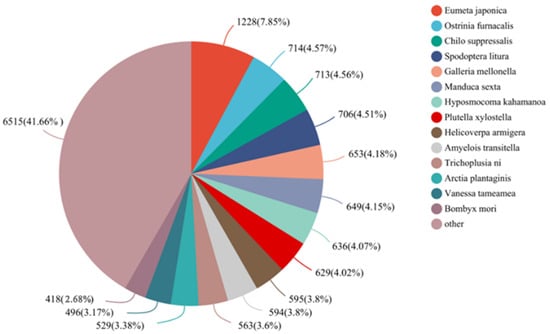 Approximately 34.82% showed matches to entries in the Nr protein database through BLASTx, with an E-value cutoff of 1e-5. The top sequence matches were found in Eumeta japonica (1228, 7.85%), followed by O. furnacalis (714, 4.57%), Chilo suppressalis (713, 4.56%), Spodoptera litura (706, 4.51%,) and so on (Figure 2).