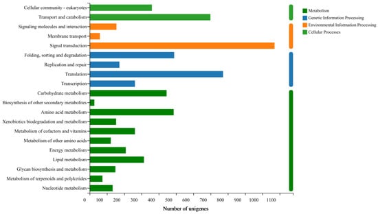 Through the integration of KEGG database analysis, we identified 8929 unigenes participating in 4 metabolic pathways. Among these pathways, the top three most annotated ones are as follows: signal transduction accounting for 11.98%, translation representing 8.65%; transport and catabolism contributing to 7.83%, respectively (Figure 4).