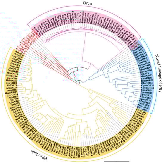 According to the phylogenetic tree of OBPs supporting EsigGOBP7 as the PBP of E. signifer [15], in this study we changed EsigGOBP7 to EsigPBP1. In this phylogenetic tree of OBPs (Figure 5), the PBPs clades included EsigPBP1 (EsigGOBP7, red), EsigPBP2 (red), EsigPBP3 (red), PxylGOBP1, and all Lepidoptera PBPs. The PBP clade had a 100% support rate (labeled with blue). In the NJ tree of ORs (Figure 6), we found there were three clades; the PRs clade (yellow) was found to be a sister clade to the clade that contained the novel lineage of PRs clade (blue), Orco clade (pink), and all other EsigORs. What is more, there is the close relationship between the clade of Orco and novel lineage of PRs. Additionally, EsigOR10 and EsigOR22 are in the clade of novel lineage of PRs, while EsigOR13 was positioned within the Orco clade. Interestingly, there were no EsigORs found within the PRs clade itself (yellow).