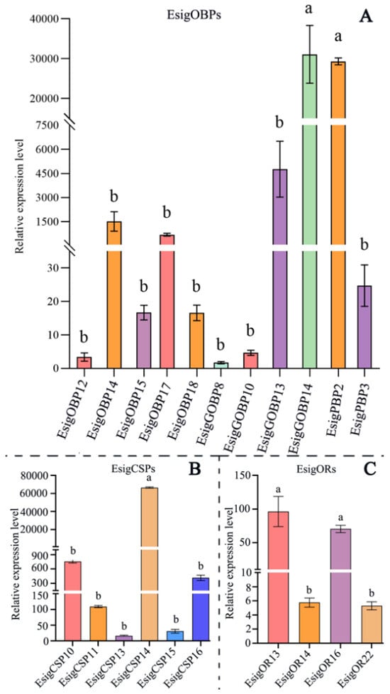 Based on the designed qRT-PCR primers and reference genes (Ribosomal protein, RIB, and Elongation factors, EF) [25]. The expression of 11 OBPs, 6 CSPs, and 4 ORs were determined in the adult antennae (Figure 7). All tested genes were expressed in adult antennae (Figure 7). For binding protein, EsigCSP14, EsigPBP2, and EsigGOBP14 exhibited the highest levels of gene expression. Among OBPs, EsigPBP2 and EsigGOBP14 had significantly higher expression levels than other all OBPs (p < 0.05). For PBPs, EsigPBP2 had significantly higher expression than EsigPBP3 (p < 0.05). EsigGOBP14 displayed significantly higher levels of expression compared to the other OBPs (p < 0.05), while the expression of the remaining OBPs did not exhibit any significant differences (Figure 7). In CSPs, the expression of EsigCSP14 was significantly higher than that of the other five CSPs (p < 0.05) (Figure 7). In ORs, their expression levels were generally lower compared to those of the binding proteins. The expression levels of EsigOR13 and EsigOR16 were the highest among the odorant receptors, with no significant difference observed between them. Both were significantly different from EsigOR14 and EsigOR22 (p < 0.05) (Figure 7).