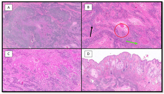 (A) Photomicrograph showing a neoplastic lesion that is difficult to discern at this magnification into its two components: epithelial and inflammatory (hematoxylin–eosin, 10×). (B) Histopathological micrograph showing the two different components of the lesion: large, epithelioid cells with palely eosinophilic cytoplasm (green arrow) and brisk lymphoplasmocytic inflammatory infiltrate (black arrow). Note the important presence of squamous differentiation (red circle) (hematoxylin–eosin, 20×). (C) Low-power magnification of B (hematoxylin–eosin, 20×). (D) Photomicrograph showing no connection of the neoplasm with the overlying epidermis (H&E, 4×).