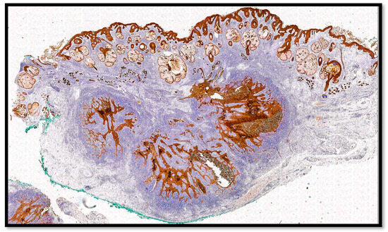Immunohistochemical preparation for anti-CKAE1-AE3 antibody: note the presence of the diffuse positivity of the neoplasm without any connection with the epidermis (immunohistochemistry for CKAE1-AE3, 4×).