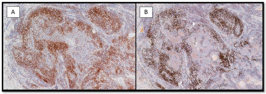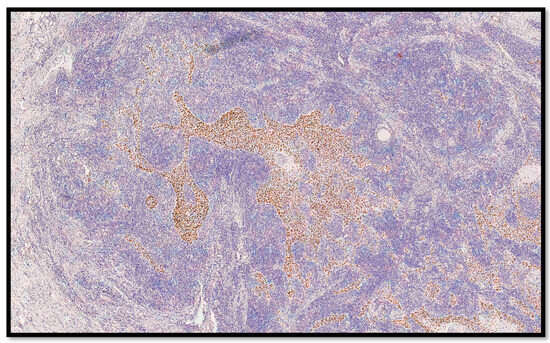 After processing, embedding in paraffin, cutting and setting up the preparation with routine hematoxylin–eosin (H&E) staining, the specimen was observed under a light microscope. Furthermore, immunohistochemical investigations with CD3 (Polyclonal Rabbit anti-Human, Dako-Agilent, Santa Clara, CA, USA) and CD20 (L26, Dako-Agilent) were performed to study the microenvironment of the neoplasm.