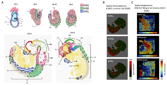 By E13.5, RARα is majorly expressed in the corpus callosum and corpus striatum. At no point is RARγ (blue line shading) detected in the developing central nervous system (CNS). Its expression seems to be strongly repressed in this tissue layer, only appearing at the regions of frontonasal process (FNP), limb bud regions (HL, FL), and prevertebrae (Pv) from E9.5 onwards [40]. This summarized view concerning the distribution of RARs during embryo development is further supported with recent high-throughput data obtained by spatial technologies, like spatial transcriptomics or spatial epigenomics. These methods allow researchers to capture localized gene expression or histone modification enrichment signatures within a tissue section. Specifically, the team of Dr. Rong Fan at Yale University developed a microfluidics system allowing to transport molecular biology reagents in a grid-based manner on top of a tissue section, thus allowing distinct molecular barcodes to be ligated to either cDNA or chromatin cleaved regions associated with specific histone modification marks [42,45]. This methodology has been evaluated on mouse embryos, which allowed us to query for molecular signatures associated with RAR isotypes. Indeed, the preferential RARβ expression along the spinal cord is fully recapitulated in spatial transcriptomics assays (Figure 1B: E.10; Y. Liu et al. [42]), and the described repression of RARγ in the developing CNS is fully confirmed by spatial epigenomics profiling targeting the histone modification H3K27me3, the most well-characterized gene silencing marker [47]. Similarly, the RARγ preferential expression at the frontonasal process (FNP), displayed in Figure 1A, correlates with the presence of the active marks H3K4me3 and H3K27ac, which concomitantly are known to create an open chromatin environment permissible to transcription [47] (Figure 1C: E13.5; Deng et al. [45]).