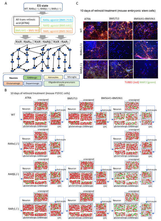Disentangling neuronal cell specialization driven by retinoid action. (A) Scheme illustrating the strategy applied by Koshy et al. [25] to discern the role of each RAR isotype receptor during cell specialization. Wild-type (WT) and RAR knockout P19 mouse embryonal carcinoma stem cells (ES state) are either treated with the pan-RAR agonist (AtRA), or with each of the indicated synthetic agonists activating specific RAR isotypes, as well as the combination of the RARγ (BMS961) and RARβ (BMS641) agonists. The use of these RAR agonists is expected to initiate a transcription regulation cascade, leading to the induction of gene programs defining the emergence of the various neuronal subtypes as well as glial cells. (B) Gene regulatory networks established from transcriptomes assessed in P19 embryonal carcinoma cells (WT or RAR knockout lines) treated with each of the indicated RAR agonists (10 days). Notice that the concomitant activation of both RARβ and RARγ receptors leads to the activation of genes associated with the indicated neuronal subtypes (dopaminergic, glutamatergic, and GABAergic) as well as with astrocytes and oligodendrocyte precursors (OPC) in WT and RARα (−/−) cells. Data corresponding to RARα (−/−) cells treated with the BMS753 ligand were not assessed since cells do not differentiate in this context. (C) Immunostaining micrographs revealing the presence of β-III tubulin positive neuronal precursors, as well as mature neurons (MAP2) in mouse embryonic stem cells differentiated in the presence of either the pan-agonist AtRA, the RARα agonist BMS753, or the combination of the BMS641 and BMS961 agonists, activating the RARβ and RARγ receptors. This synergistic action of the BMS641 and BMS961 agonists has been also confirmed in Rarα(−/−), but not Rargγ(−/−) knock-out cells [25].