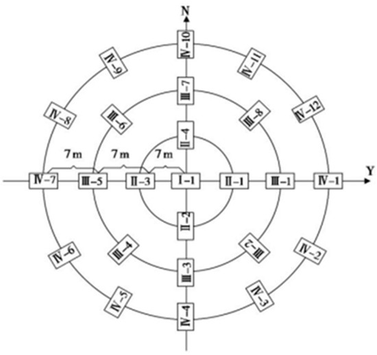 In April 2018, three experimental plots were selected from the same habitat type in a representative desert area of southern Alxa Left Banner as the sterile agent test areas (A, B, C) and an equal area as the control area (CK), for a total of four plots, each with a plot area of 1.5 hm2. A steel wire fence and an asbestos tile were used as fences to close the plots. The ground height was 90 cm and the depth underground was 60 cm to prevent rodents from escaping after digging holes. There were only midday gerbils present in the sample area, with no other rodents or animals present. An isolation buffer zone with a width of more than 100 m was set between the plots, and the isolation buffer zone was not sampled. Each plot was divided into three groups of standard quadrats for repeated sampling, with a standard quadrat area of 0.138 hm2. The quadrat setting followed the principle of random and uniform, and considered the relative density of midday gerbil holes, using concentric circular cages (Figure 1). A group of concentric circles was established in each standard quadrat. Each group of concentric circles was composed of three concentric circles of different sizes, and 25 cages were used. The center of the concentric circle was used to select the location of the concentrated area of the home range. There were 1, 4, 8, and 12 cages from the inside to the outside. The radius difference of each concentric circle was 7 m, and the cages were evenly distributed with east, south, west, and north as the main azimuth axes. Starting from the east azimuth axis, the cages were numbered by outward diffusion from the center of the circle.