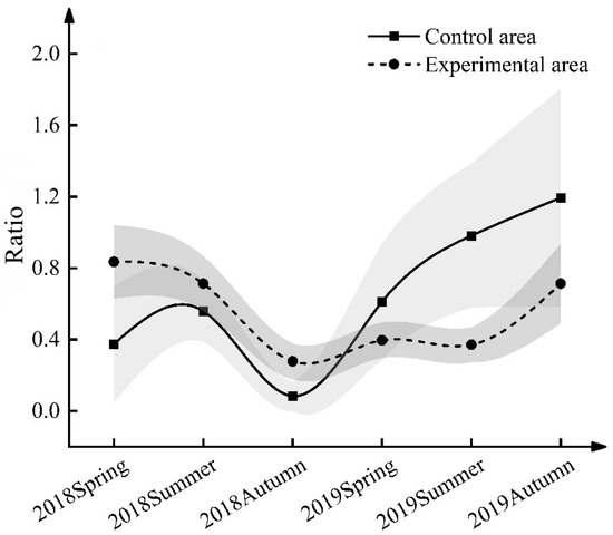 The sex ratio (♀/♂) of midday gerbils in the control area and the experimental area from 2018 to 2019 was analyzed (Table 3, Table 4 and Table S5 and Figure 3). The results of the Type III analysis of variance show that there was an interaction between groups and seasons and years (F = 2.581, p = 0.015) (Table 3). Further comparison of the average value (control area vs. experimental area) shows that there was no significant difference in the sex ratio of midday gerbils between the control and experimental areas in 2018 (Table 4, Figure 3). The seasonal sex ratio was less than 1, indicating that the midday gerbil population had a male deviation phenomenon during that year, that is, the number of male individuals was higher than that of female individuals. In the summer of 2019, the sex ratio of midday gerbils in the control area reached 0.98, which was significantly higher than that in the experimental area at the same time (p < 0.05) (Table 4, Figure 3). In the autumn of 2019, although there was no significant difference between the sex ratio of midday gerbils in the control area and the control area, it also reached 1.19 (approaching 1:1), while the sex ratio of midday gerbils in all seasons of the experimental area did not reach 1 in 2019. The contribution of females is generally higher than that of males during population growth. The increase in the number of females in the control area in 2019 indicates an increase in the reproductive potential of the population. The ratio of females to males decreased in the experimental area in the summer of 2019, limiting their reproductive potential.