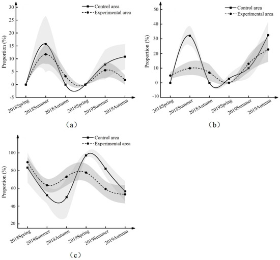 Proportion of different age structures of midday gerbils from 2018 to 2019 ((a): juvenile; (b): sub-adult; (c): adult. Gray parts are banded error lines.