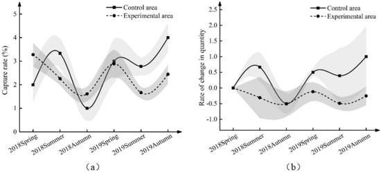 Capture rate of midday gerbils during the breeding period ((a): female; (b): male. Gray parts are banded error lines.