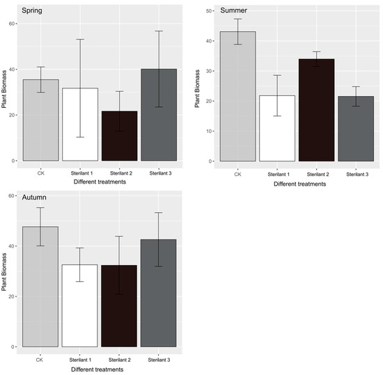 In 1930, Fisher pointed out that since every individual from sexual reproduction has only one father and one mother, the reproductive value of the male parent and the female parent is equal in general. Therefore, if the sex ratio of the population deviates from the same number of females and males, the scarce sexes will have a selective advantage until the sex ratio is equal [47]. For dioecious animals, environmental factors and time factors have certain regulatory effects on the population sex ratio [48]. In 2018, the sex ratios of midday gerbils in the control area and the experimental area were less than 1, namely the number of female midday gerbils was less than that of male midday gerbils. After internal adjustment for 1 year, the sex ratio of midday gerbils in the control area approached 1:1 in 2019, which was consistent with Fisher’s sex ratio theory [47], and the sex ratio of midday gerbils in each season tended to be stable, while the sex ratio of midday gerbils in the experimental area did not reach 1 after one year, and the sex ratio of midday gerbils in the experimental area was significantly lower than that in the control area in the summer of 2019. In this study, the environmental factors such as soil and climate were very similar between the experimental area and the control area. At the same time, we conducted one-way ANOVA on the biomass of herbaceous plants in different blocks (Figure 6), and the results show that there was no significant difference in herbaceous biomass among different regions (spring: F = 0.293, p = 0.83; summer: F = 3.538, p = 0.0679; autumn: F = 0.662, p = 0.598). This indicates that the availability of food resources was consistent across the four blocks. This will highlight that a reduction in the number of females was not a consequence of food availability.