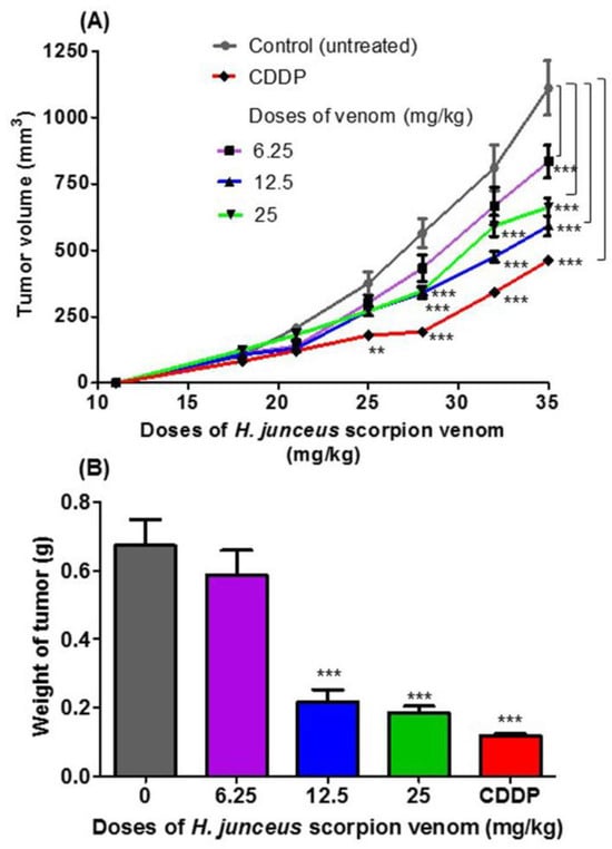 In the study comparing the tumor volume at different times among the untreated control with each concentration of scorpion venom, a repeated measures two-way ANOVA test was performed, and the Dunnett test was used as a multiple comparison method. This comparison was conducted using the statistical software R version 4.1.1 (R Foundation for Statistical Computing, Vienna, Austria). The one-way ANOVA method was applied in rest of studies, and multiple comparisons were performed using Tukey’s test, using the GraphPad Prism version 5.01 program (GraphPad Software Inc., San Diego, CA, USA). In all cases, differences were considered significant when p < 0.05.
